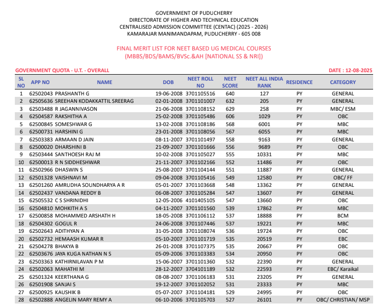 Puducherry State Merit List Contains Merit Rank denotes by State Rank , Application Number, Name, DOB, NEET Roll Number, Score, All India Rank, Residence, and Category.