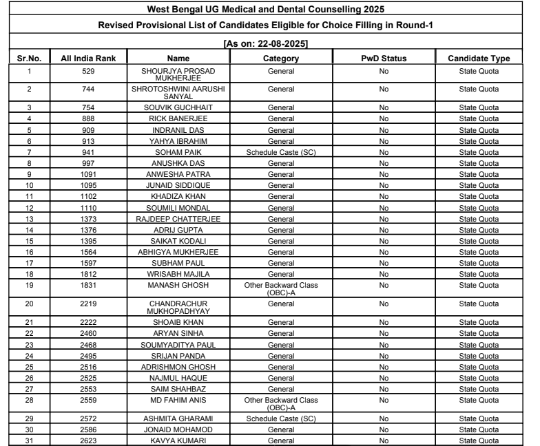 MBBS Admission Counselling for West Bengal State Quota is conducted by Department Health & Family Welfare. It will release NEET 2025 Eligibility Candidates List after state counselling registration and choice filling. During 2025, 11178 candidates applied for WB counselling and submitted their choices during 1st round counselling.